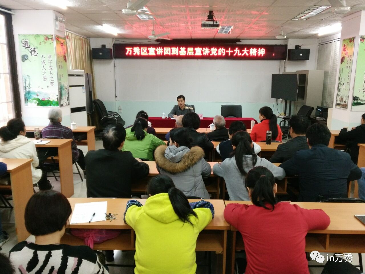 前言: 为了深入学习宣传贯彻党的十九大精神,万秀区以领导干部、理论骨干、优秀干群为主体,组建三个层次的大宣讲队伍,通过全覆盖、拉网式的大宣讲,推动党的十九大精神深入人心,引导广大党员干部和群众深刻领会党的十九大精神的思想精髓、核心要义。 为了深入学习宣传贯彻党的十九大精神,万秀区通过外请师资的方式,组织选聘一批政治素质强、理论政策水平高、有演讲能力的理论骨干编入宣讲团,分赴基层开展宣讲活动。12月1日,市委讲师团团长于超成做为万秀区外聘名师分别到龙湖镇、城北街道办事处为基层干部群众宣讲党的十九大精神。