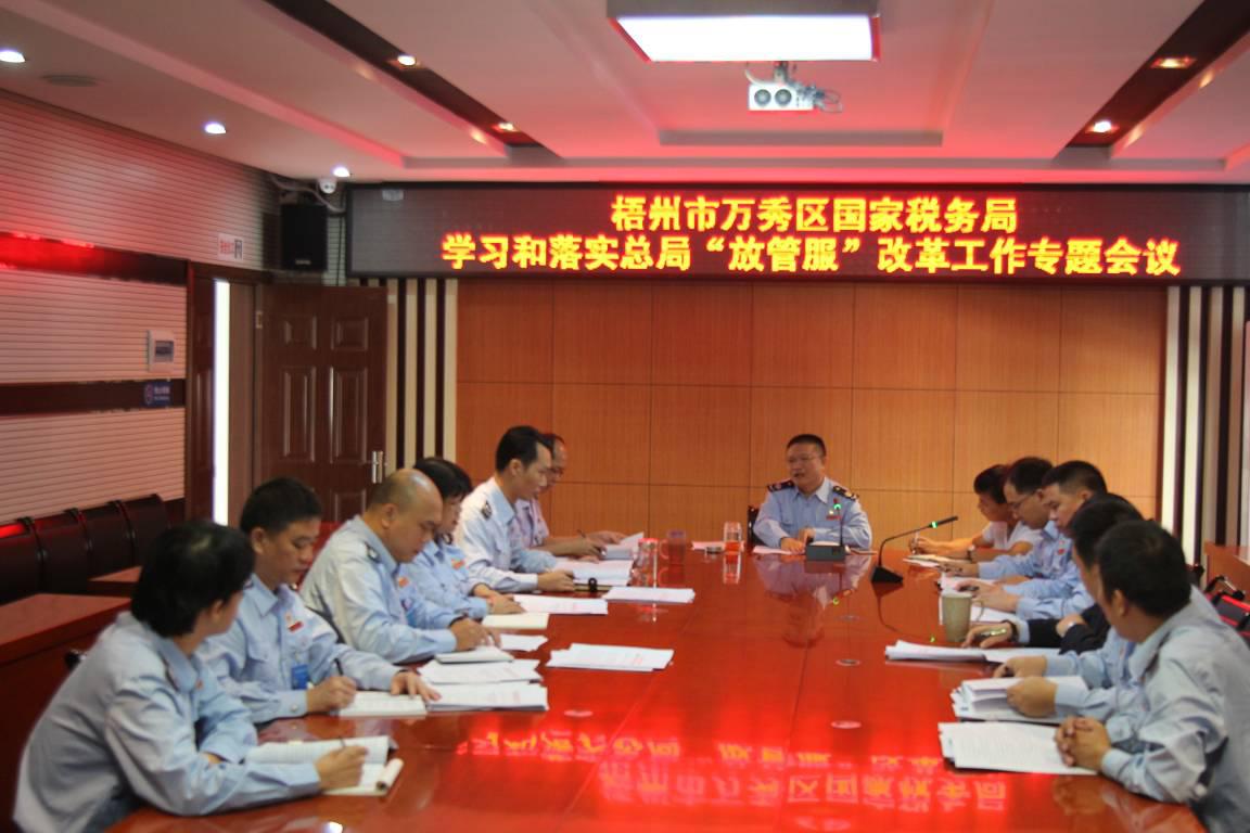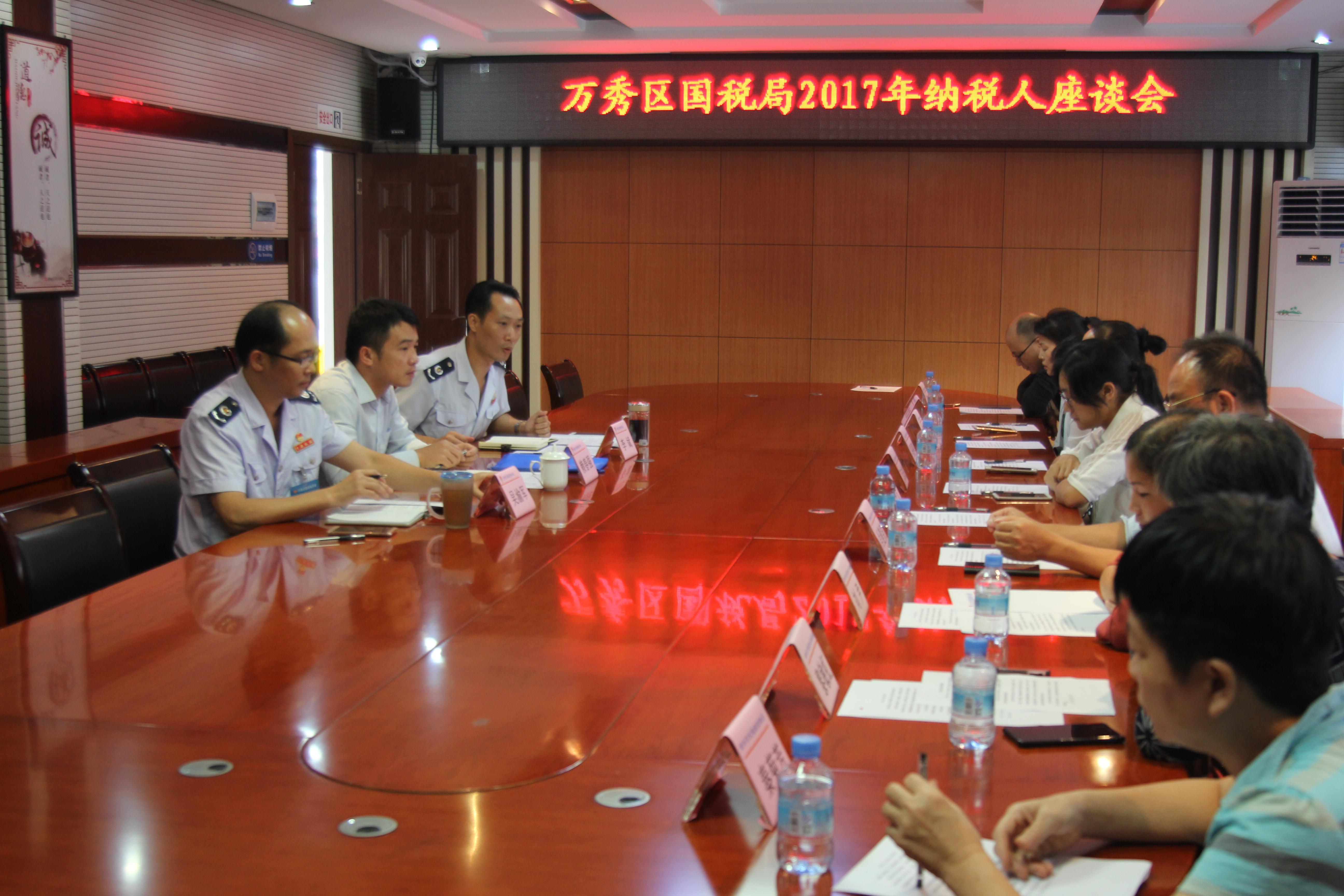 (二)万秀区国税局积极开展纳税人座谈会,了解纳税人自身情况,并悉心听取纳税人代表们对万秀区国税局工作的意见和建议,同时向纳税人宣传普及税收优惠政策,为纳税人排忧解难。 (三)万秀区国税局组织召开 “放管服”改革工作专题会议,贯彻落实总局“放管服”会议精神,简化纳税人审批手续,缩短纳税人办税时间,降低纳税成本,为纳税人提供最大的办税便利,让纳税人能及时享受到税收优惠政策。
