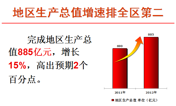 各位代表: 现在,我代表市人民政府向大会作政府工作报告,请予审议,并请各位政协委员和列席会议的同志提出意见。 2012年工作回顾 2012年,面对复杂严峻多变的经济形势,我们在自治区党委、政府和市委的正确领导下,紧紧围绕主题主线,牢牢把握稳中求进的工作总基调,以“三年一工程”为抓手,着力稳增长、强产业、固基础、扩城镇、惠民生、促和谐,保持和扩大了经济社会平稳较快发展的良好势头,圆满完成了市十三届人大二次会议确定的各项目标任务,取得了好于预期的发展成果。 ——地区生产总值885亿元,增长15%,高出预期2个百分点,增速排全区第2位;