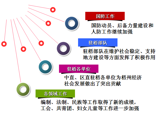 国防动员、后备力量建设和人防工作继续加强。驻梧部队在维护社会稳定、支持地方建设等方面发挥了积极作用。中直、区直驻梧各单位为梧州经济社会发展做出了突出贡献。编制、法制、民族、宗教、统计、国资、物价、外事、侨务、对台、供销、地震、粮食、农机、移民、住房公积金等工作取得了新的成绩,工会、共青团、妇女儿童、残联、老龄、科协、社会科学、慈善、档案、地方志等工作进一步加强。