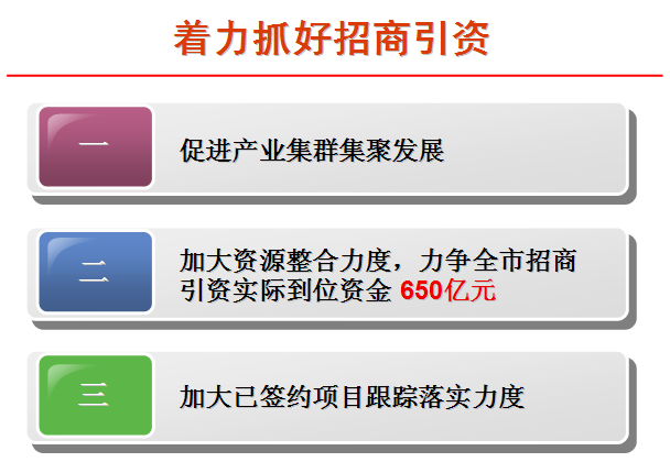 着力抓好招商引资。继续实行市领导联系招商工作队制度及“四个一”招商跟踪服务机制,以再生资源、电子信息、陶瓷、先进装备制造业等产业为招商重点,综合开展产业招商、园区招商、驻点招商、节会招商、商(协)会招商,促进产业集群集聚发展。加大资源整合力度,组建5个重点产业园区招商队和7个产业招商队,主攻珠三角、长三角等地区,大力承接东部产业转移,重点产业园区和重点产业招商队完成招商引资240亿元,力争全市招商引资实际到位资金650亿元。加大已签约项目跟踪落实力度,提高项目的合同履约率、开工竣工率和资金到位率,促进招商引资和承接东部产业转移工作迈上新台阶。。