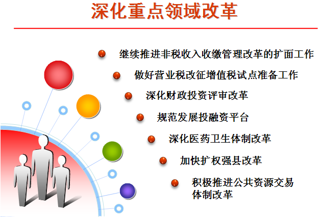 深化重点领域改革。继续推进非税收入收缴管理改革的扩面工作,全面提高非税收入收缴管理工作水平。做好营业税改征增值税试点准备工作,切实把国家结构性减税政策落实到位。深化财政投资评审改革,严把财政投资评审关。加强政府性债务的清理、监管和风险防范,规范发展投融资平台,健全政府投融资、担保平台的决策、监督、执行机制,增强调控和配置社会资本能力。深化医药卫生体制改革,巩固国家基本药物制度,稳妥推进县级公立医院综合改革试点。加快扩权强县改革。积极推进公共资源交易体制改革。
