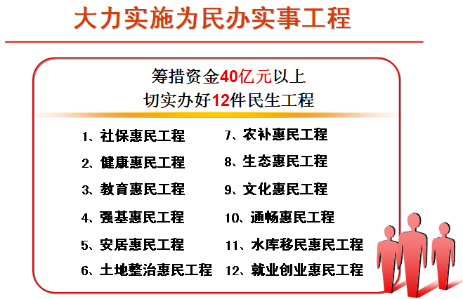 大力实施为民办实事工程。顺应人民群众过上更加幸福美好生活的新期盼,以解决人民群众最关心、最直接、最现实的利益问题为重点,筹措资金40亿元以上,切实办好12件民生工程:(1)社保惠民工程。筹措资金4.55亿元,实施城乡居民社会养老保险、城乡居民最低生活保障、残疾人“阳光家园计划”等项目;新建80个农村五保村。(2)健康惠民工程。筹措资金7.64亿元,实施新型农村合作医疗、地中海贫血防治和免费孕前优生健康检查等项目;对15所乡镇卫生院进行危房改造,抓好2个社区卫生服务中心标准化建设,建成1.1万座农村无害化卫生厕所。(3)教育惠民工程。筹措资金2.08亿元,实施职业培训、扩大农村学前教育资源、农村义务教育学生营养改善计划等项目,对考上大学的贫困生、就读普通高中的贫困学生、就读中职的全日制学生进行资助。(4)强基惠民工程。筹措资金1.17亿元,实施农村饮水安全解困工程、基础设施建设扶贫工程。(5)安居惠民工程。筹措资金12.35亿元,实施城镇公租房、安置房、廉租房和城市棚户区改造等项目,完成6000户农村危房改造。(6)土地整治惠民工程。筹措资金2.55亿元,对42个村实施整村推进土地整理,实施地质灾害治理等项目。(7)农补惠民工程。筹措资金5200万元,实施农机具购置补贴、粮食作物良种补贴等项目。(8)生态惠民工程。筹措资金8696万元,实施“绿满八桂”造林绿化工程、森林生态效益补偿、农村环境连片整治等项目,新建农村沼气池4200座。(9)文化惠民工程。筹措资金3511万元,实施农村公益电影放映、公共文化基础设施场所免费开放等项目,完成72个村级公共服务中心建设。(10)通畅惠民工程。筹措资金5亿元,实施183个建制村道路硬化工程,实现建制村全部通沥青(水泥)路。(11)水库移民惠民工程。筹措资金452.8万元,建成6个水库移民新村。(12)就业创业惠民工程。筹措资金3.35亿元,实施大学生科技创业园、农民创业园等就业创业帮扶工程;发展2500家微型企业,解决13000人就业。